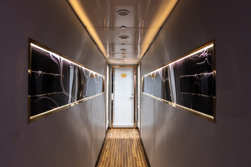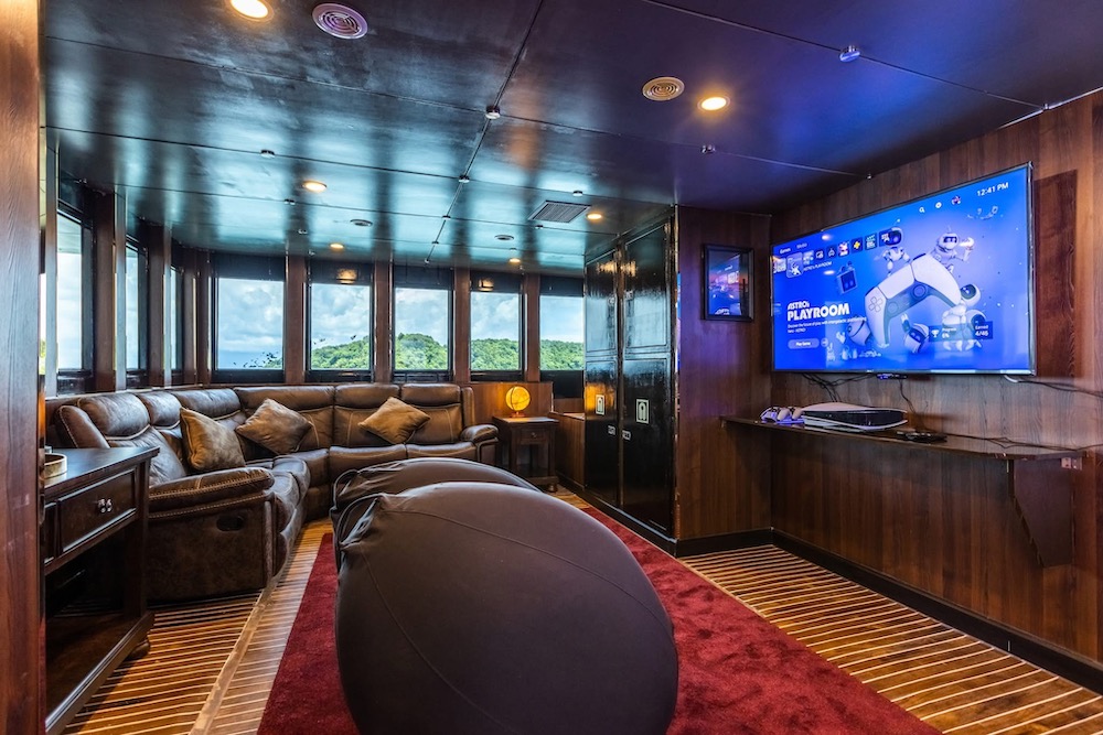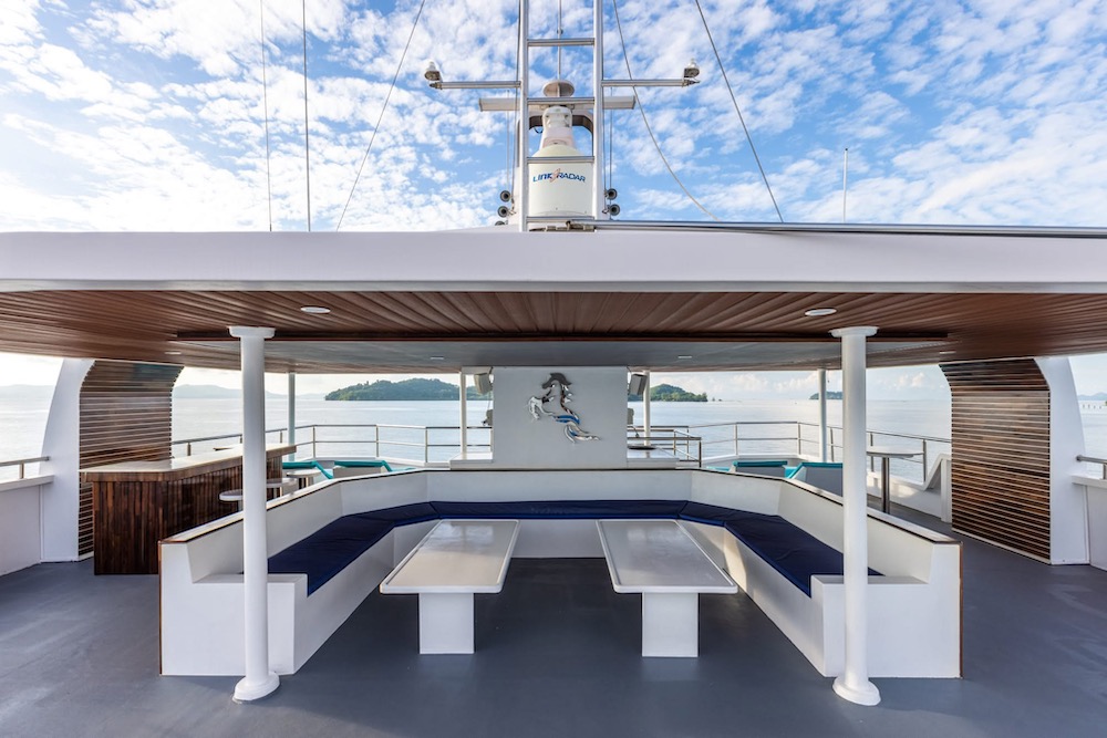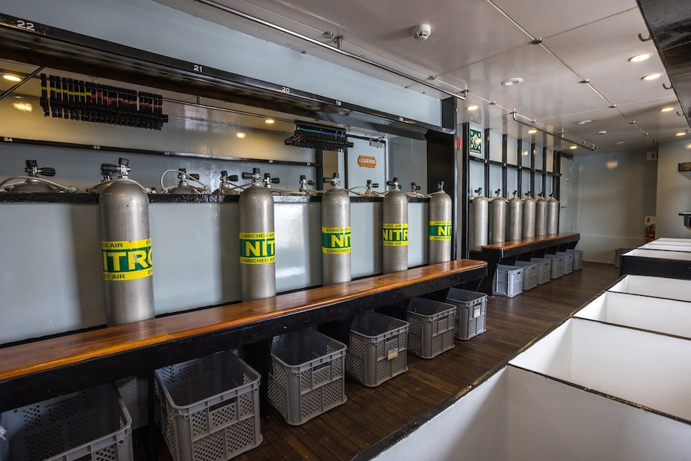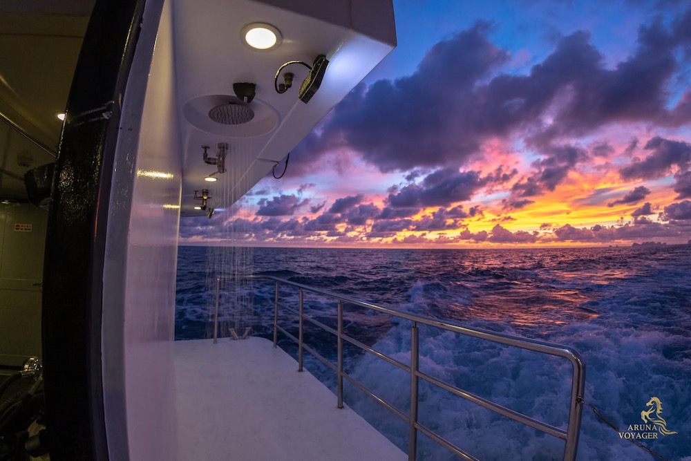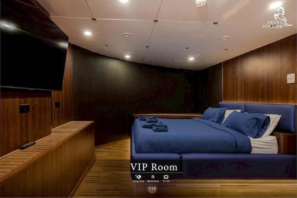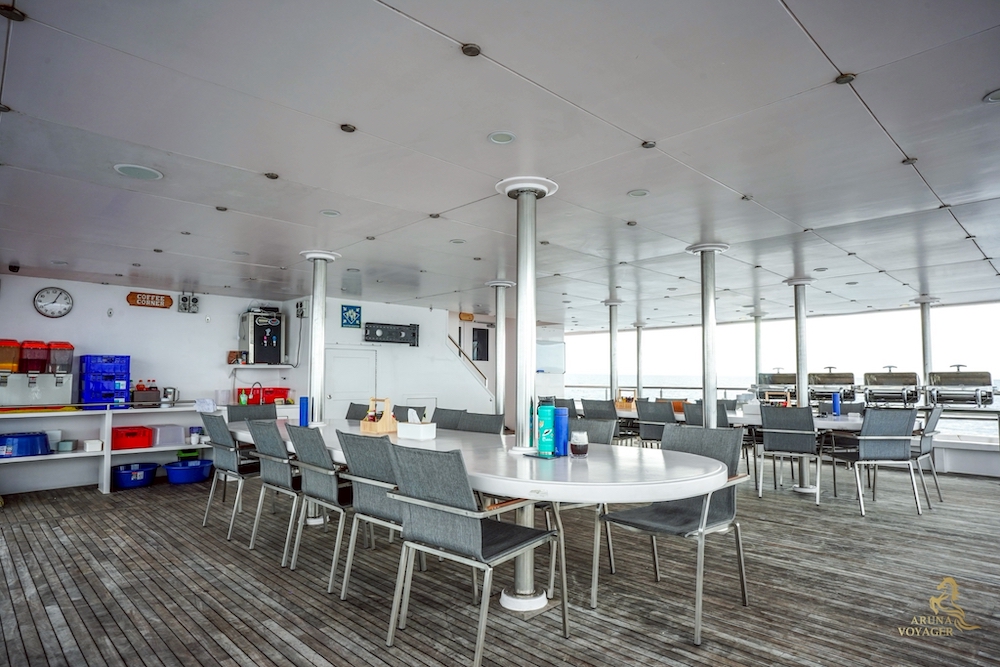 アルーナは全長約36メートル、幅12メートル、5階建ての大型ダイブクルーズ船で、最大定員は30名です。船内には広々としたエアコンサロンやオープンデッキ、サンデッキなど快適な共有スペースを完備。全キャビンにはシャワー・トイレと、明るい自然光が差し込む窓が設置されています。ナイトロックス対応のほか、カメラ専用スペースや充電ステーション、広めのダイブデッキなど、ダイバーに嬉しい設備が充実。個人旅行にも便利なシングルキャビンもご用意しています。