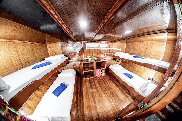 全長28m、定員20名のこのボートは、豪華な設備はありませんが、シンプルながらも小回りが効く、快適なボートです。キャビンはツイン、ダブル、4部屋の3種類。もちろんエアコン完備です。屋上は、海を見渡す広々としたサンデッキになっていて、リゾート気分満点です。