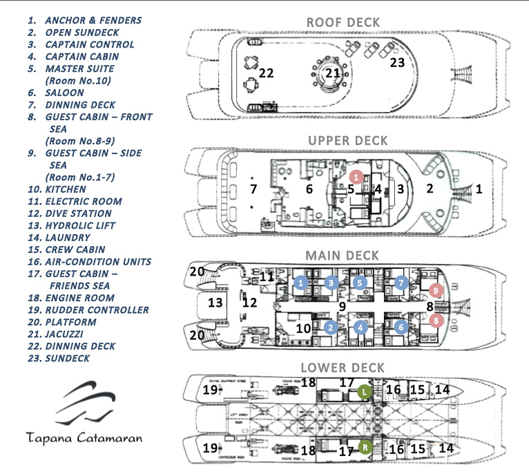 タパナカタマランは、2015年に完成、最新鋭のカタマランタイプのクルーズ船。エレベーター式プラットフォームやジャグジーなど、他のクルーズ船にはない贅沢な設備を完備した、快適さを追求した新クルーズ船です。一般的なダイビング設備が充実した快適なクルーズ船です。