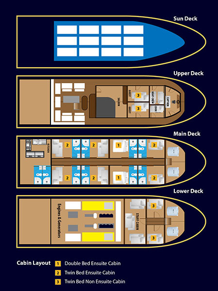 LENGTH:27m BEAM:5m CAPACITY:22 guests CABINS:SHARE 4 BEDS DOUBLE TWIN (ALL AIRCONDITIONED) BATHROOM:ALL EN-SUITE(except Non En Suite) FRESH WATER:16,000 L ELECTRIC DUPPLY:220V、24V COMPRESSOR:Bauer Mariner×2 ENGINES:HINO 450HP ×2 OTHER EQUIPMENTS: ・NITROX MEMBRANE SYSTEM ・GPS, DEPTH SOUNDER ・O2 BOTTLE ・FIRST AID KIT ・VHF RADIO