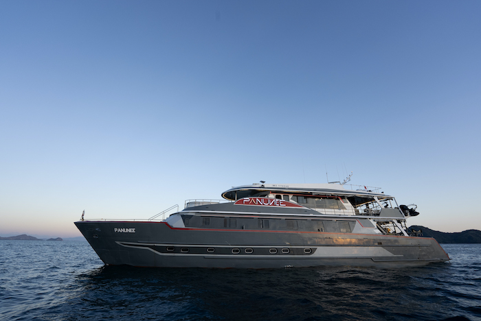 The Panuni is a steel cruise ship that's 42m long and accomodates 22 people. As well as standard diving equipment, there is a Nitrox filling station, a spacious in-room diving area, camera station and comfortable common areas including an open-air deck and sun deck.Cabins include a suite with toilet and shower, and delux ones with shared showers.The delux cabins also have single beds,ideal for people travelling alone.