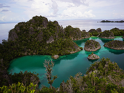 There are said to be over 30 main dive sites around Raja Ampat. We'll check conditions on the day and dive at the best ones. The day you board the ship will be travel only, and during the night we'll sail towards Raja Ampat. When you wake up the next morning, a bright blue sea and deep green islands will be spread out before your eyes. Cape Kri and Mansuar Corner are two dive sites located around Mansuar Island,a long, thin island that stretches from southwest to northeast. These sites are home to colourful coral reefs that are spread all over like a carpet, and countless reef fish are there to welcome divers. At Gam Island slightly north, there's a high chance of encountering manta rays at the dive site Manta Sandy, where huge manta rays gather to be cleaned. If you're lucky, you might also spot the black manta with its black belly, or the white manta. Other sites include Mike's point, where fish including the endemic yellow ribbon sweetlips gather together, and Mioskon Reef, where you can spot the star of macrolife, the pygmy seahorse. This cruise is extremely satisfying. You'll enjoy a rich, varied ocean with large species, shoals of fish, macrolife and views of stunning coral reefs. During the cruise we'll also have time to go ashore. The view from the mountains is simply impossible to describe in words.