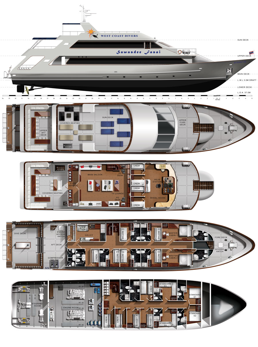 LENGTH:37 m BEAM:7.8 m CAPACITY:26 guests CABINS:MASTER ×2 :DELUXE ×4 :STANDARD ×4 :BUDGET ×3 (ALL AIRCONDITIONED) BATHROOM:ALL EN-SUITE(except BUDGET) FRESH WATER:25,000 L ELECTRIC DUPPLY :220V、24V COMPRESSOR:Bauer Mariner×1,LW×1 ENGINES:Cummins KTA 19M 500HP ×2 OTHER EQUIPMENTS: ・NITROX MEMBRANE SYSTEM ・GPS, DEPTH SOUNDER ・O2 BOTTLE ・FIRST AID KIT ・VHF RADIO ・SAFTY BOX (in each cabins) ・Wi-Fi